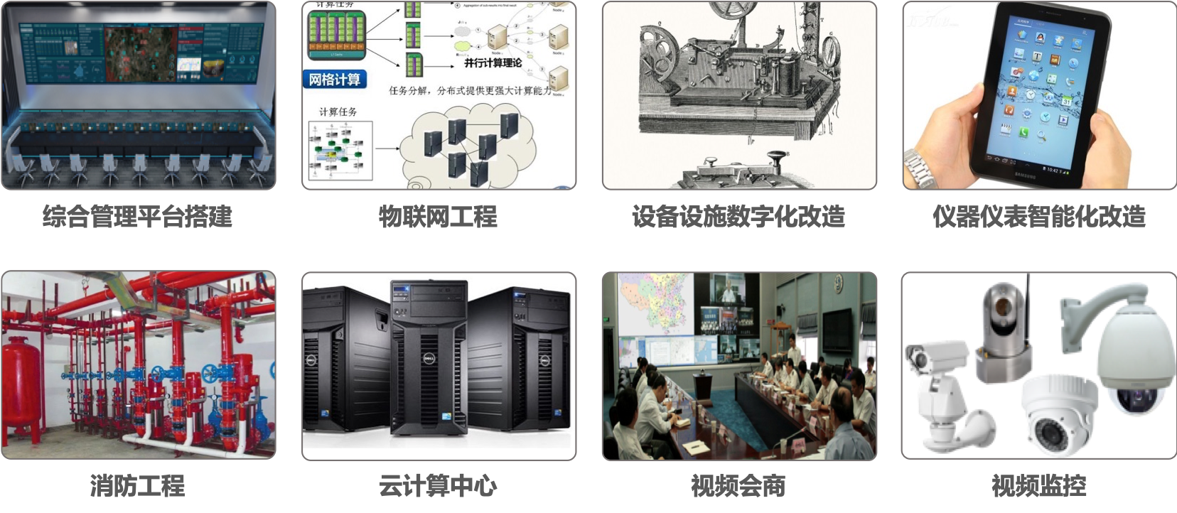 基于物聯(lián)網(wǎng)、云計(jì)算、網(wǎng)絡(luò)等主流IT技術(shù),提供網(wǎng)絡(luò)、硬件和信息系統(tǒng)集成服務(wù)。如綜合管理平臺(tái)搭建、物聯(lián)網(wǎng)工程、設(shè)備設(shè)施數(shù)字化改造、儀器儀表智能化改造、消防工程、云計(jì)算中心、視頻會(huì)商、視頻監(jiān)控等。